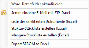Das erzeugen der Stückliste findet direkt in Primus statt. Dazu wird mit der rechteb Maustaste das Kontextmenü des Dokuments aufgerufen. Dort gibt es einen Menüpunkt Office. Hier hat der Anwender die Wahl zwischen verschiedenen Arten der Stückliste. Die erzeugten Stücklisten werden als Exceltabellen, im Register Anhänge abgelegt.
