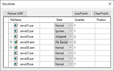 | Aufgeteilt | Das Dokument selbst erscheint nicht in der Stückliste, aber alle darin enthaltenen Elemente. Nur sinnvoll bei Baugruppen |